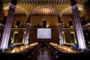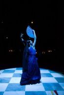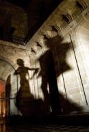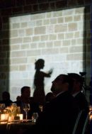 Light from multiple directions project silhouettes of the two performers around the walls of the venue making the whole experience seem bigger and more inclusive.